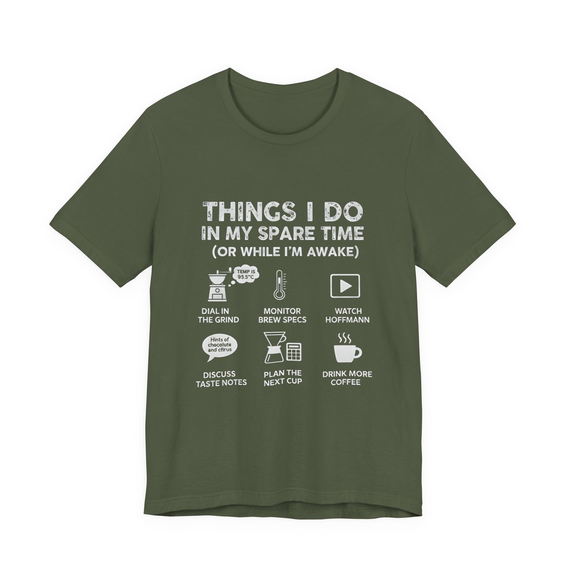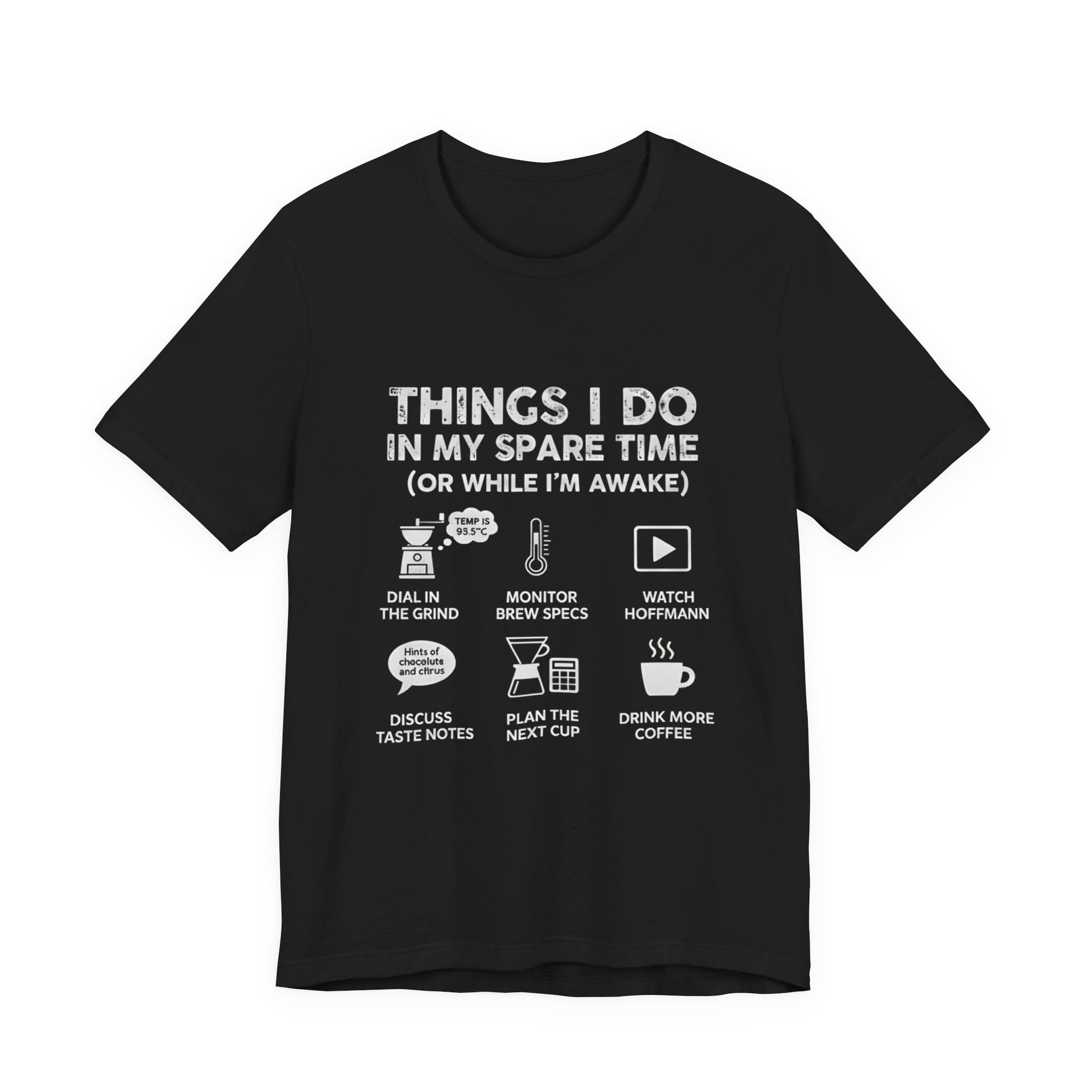 Elevate your coffee game and your wardrobe with our "Things I Do In My Spare Time (Or While I’m Awake)" t-shirt. This isn’t just a shirt; it’s a tribute to the precision, science, and slight madness of specialty coffee culture.